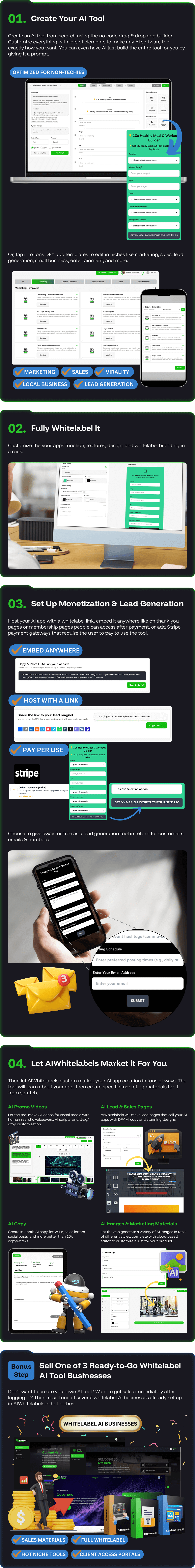 AIWhitelabels is the first AI suite that creates & markets unique AI SaaS ‘box businesses’ for you. In minutes, create 100% custom AI tools using no-code editing, whitelabel the tools, then let the app market them for you or your clients with custom AI marketing based on the tool you built.