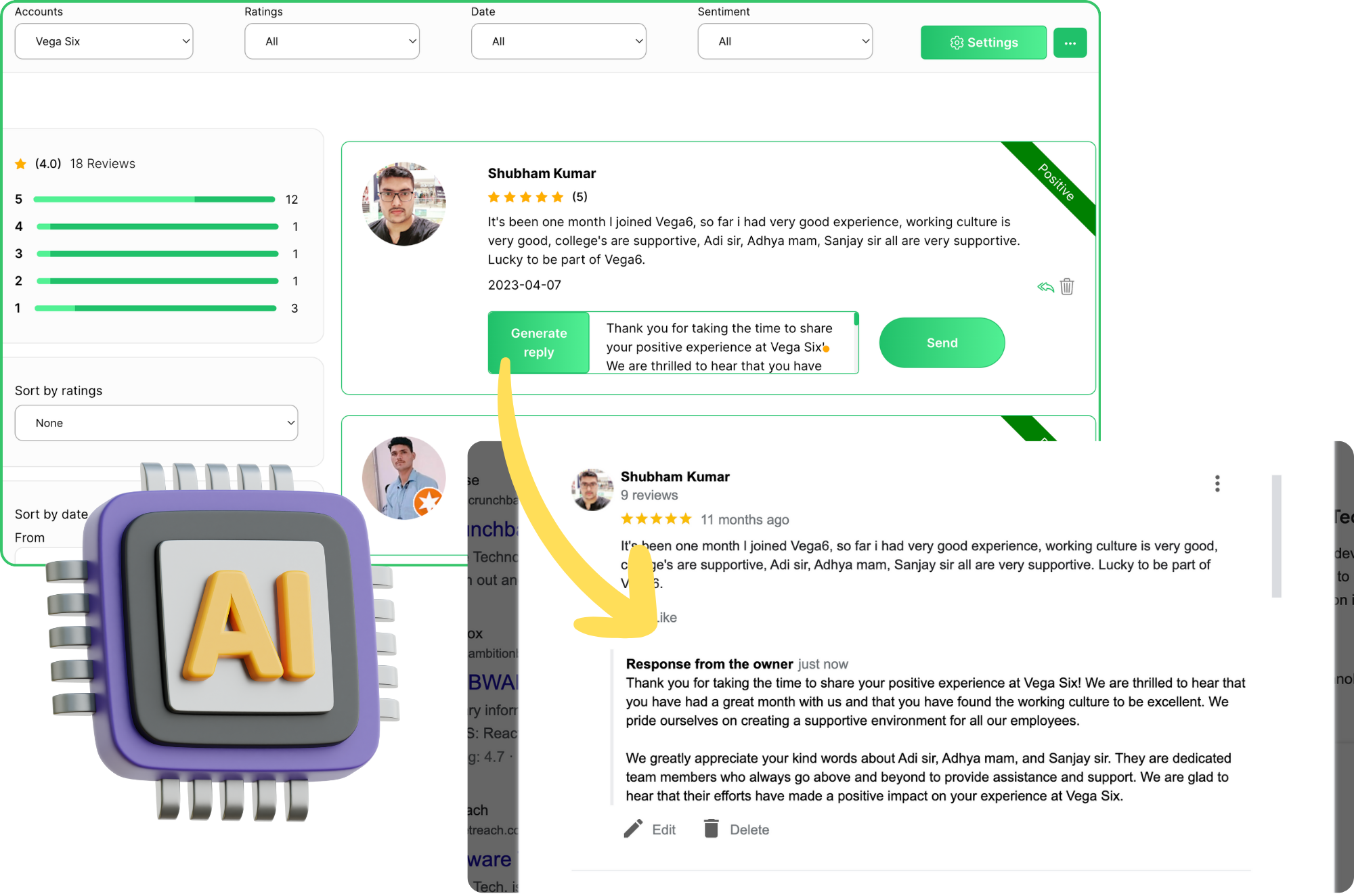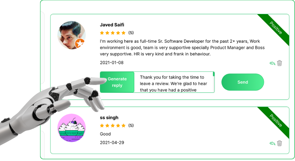 Quickly respond to reviews manually or have AI generate custom responses to each review in a click. Turn on automatic mode to have AI detect the rating of reviews and respond accordingly to both positive and negative ones hands-free.