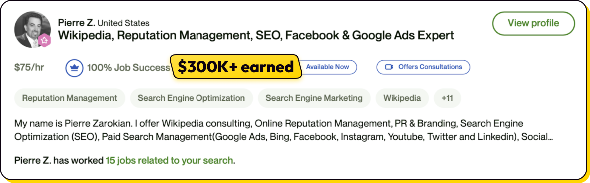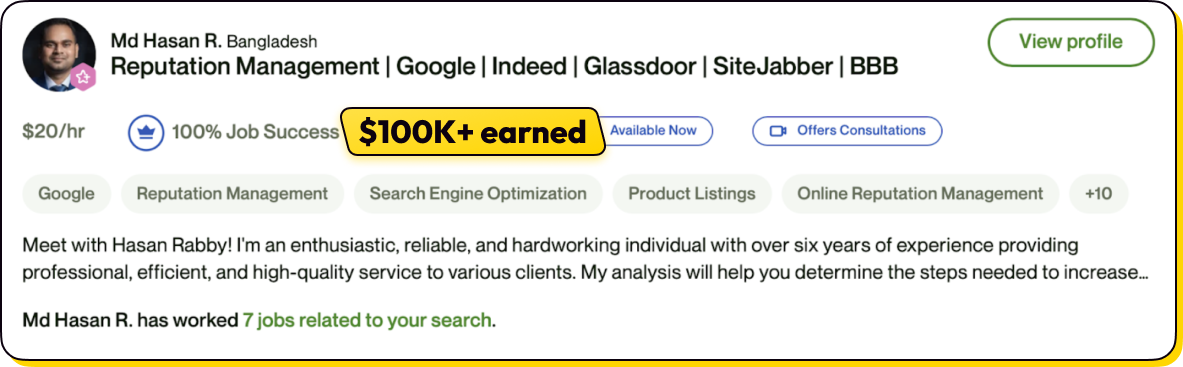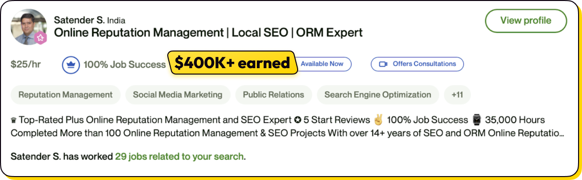 There’s so much demand for reputation management now that tons of people are making a full-time income working part-time on freelance sites like Upwork: