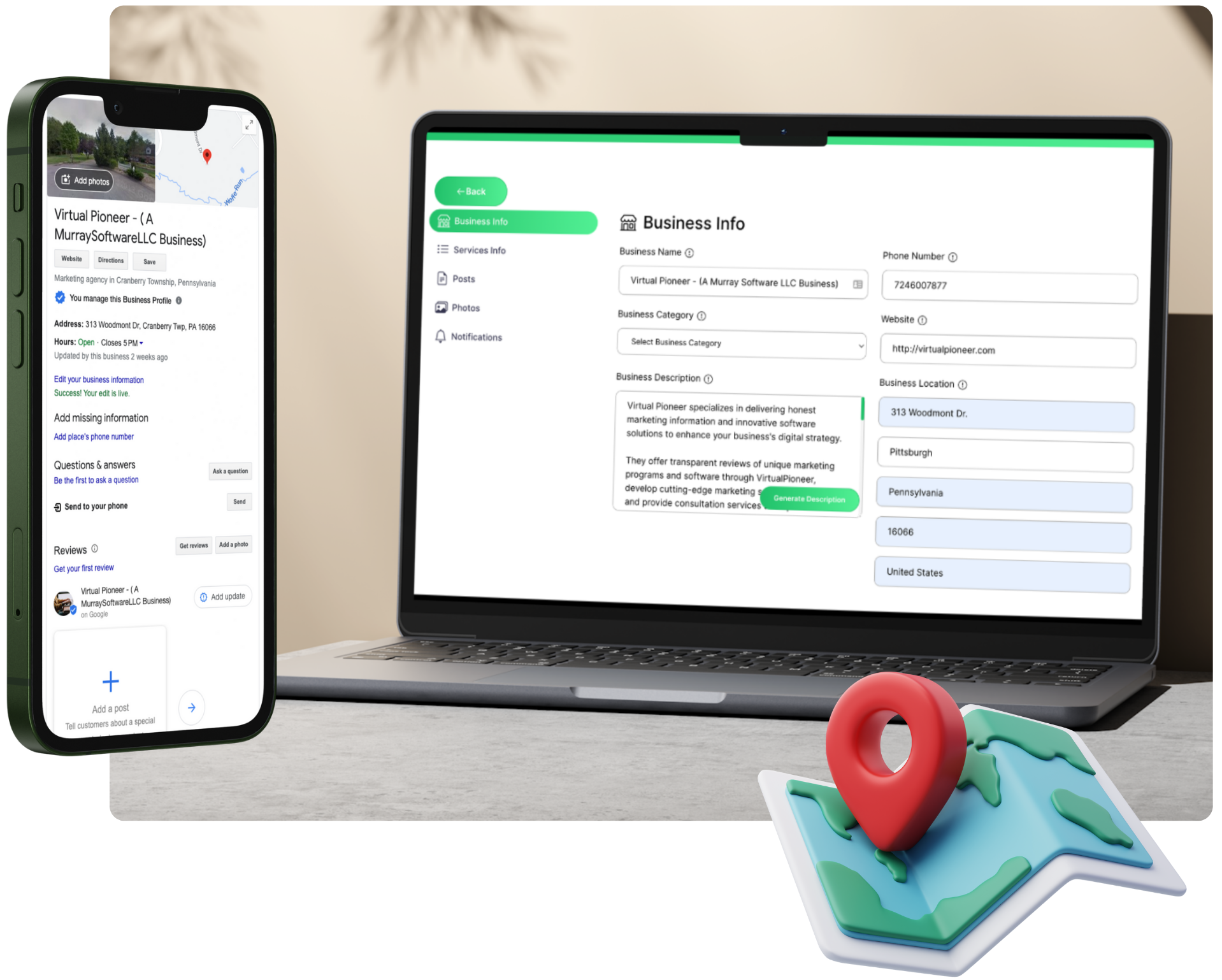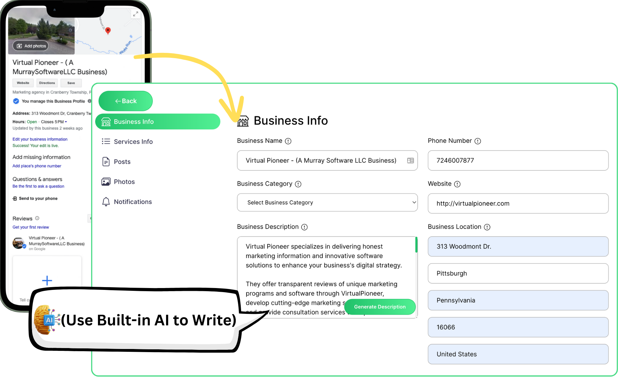 Then, claim Google Business Profile pages and other local profiles and stores through the app on behalf of the client to AI optimize and respond to reviews in a click. Use AI technology to write descriptions and titles to optimize it.