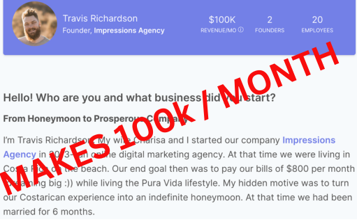 Travis went from just trying to pay bills of $800 a month to soon making 100k per month doing reputation management. He started with a goal for just $100 a month helping rank clients into the ‘3-pack’ and quickly grew to more money than he could imagine.