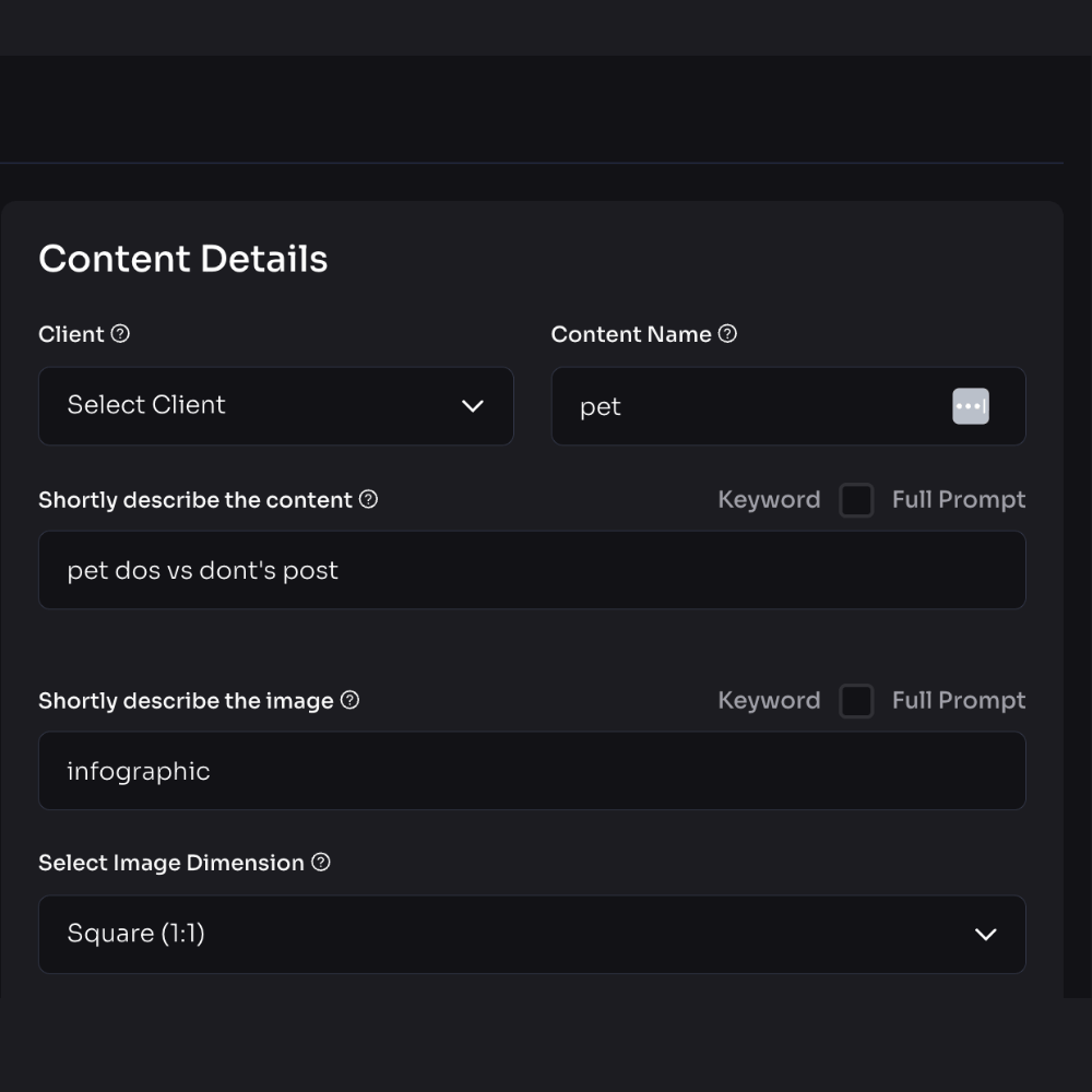 Enter a keyword or description of what you want your Instagram post to be about and choose the post dimensions. Describe what you want the AI image to look like if desired, too.