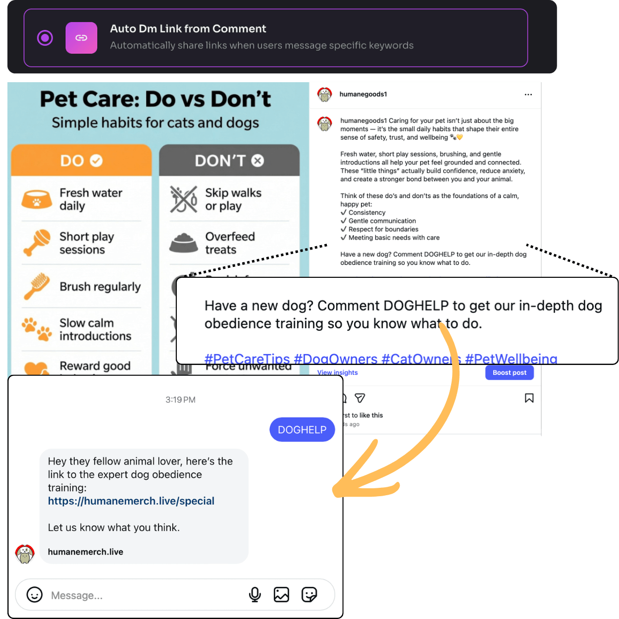When someone comments on your post asking for a link, resource, or information with a trigger word, the Genie automatically follows up in their DMs. No more manually checking comments or copying and pasting links. .