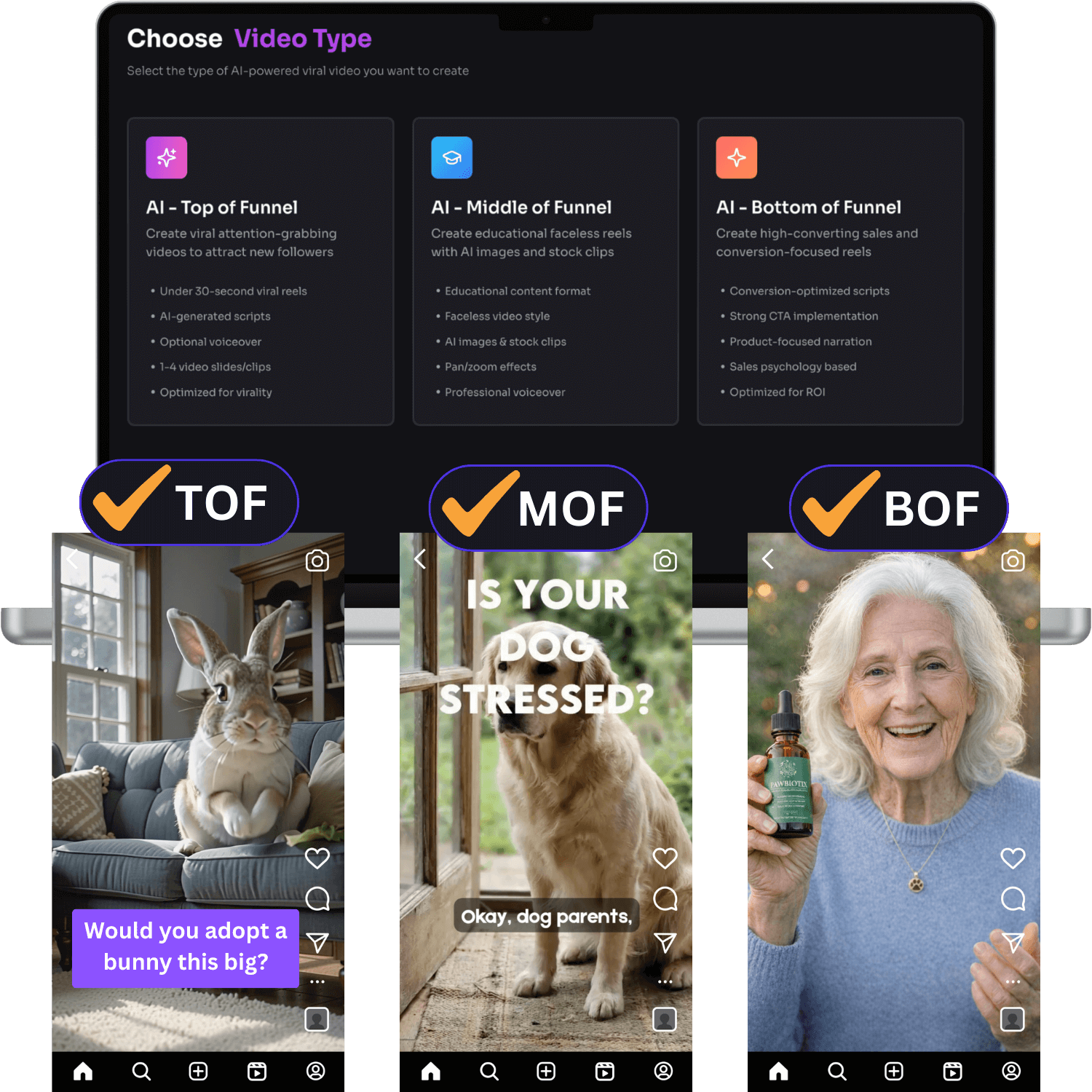 which creates TOF, MOF, & BOF videos based on your follower count and goals, using advanced AI video generation, scripts, voiceovers, and editing tools.