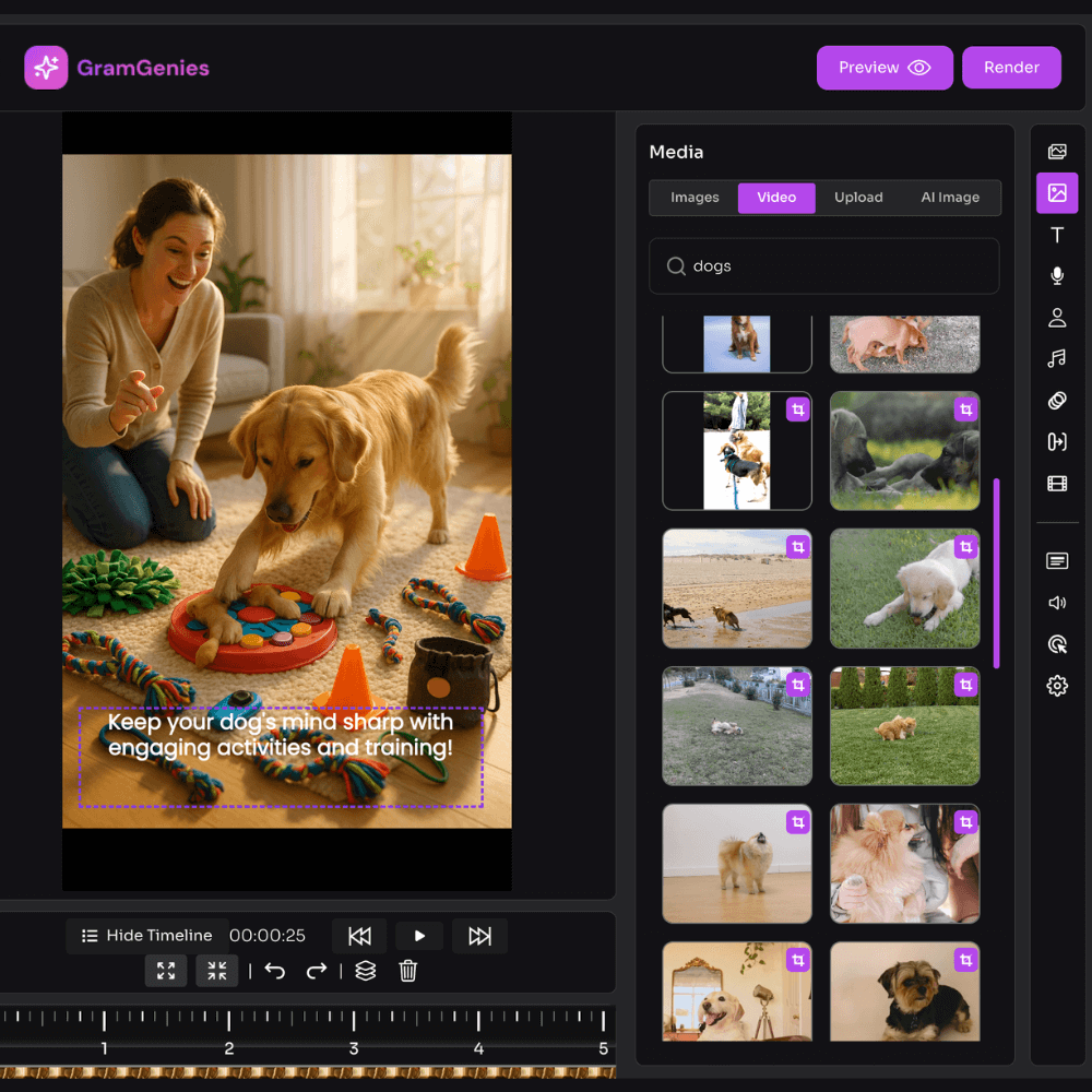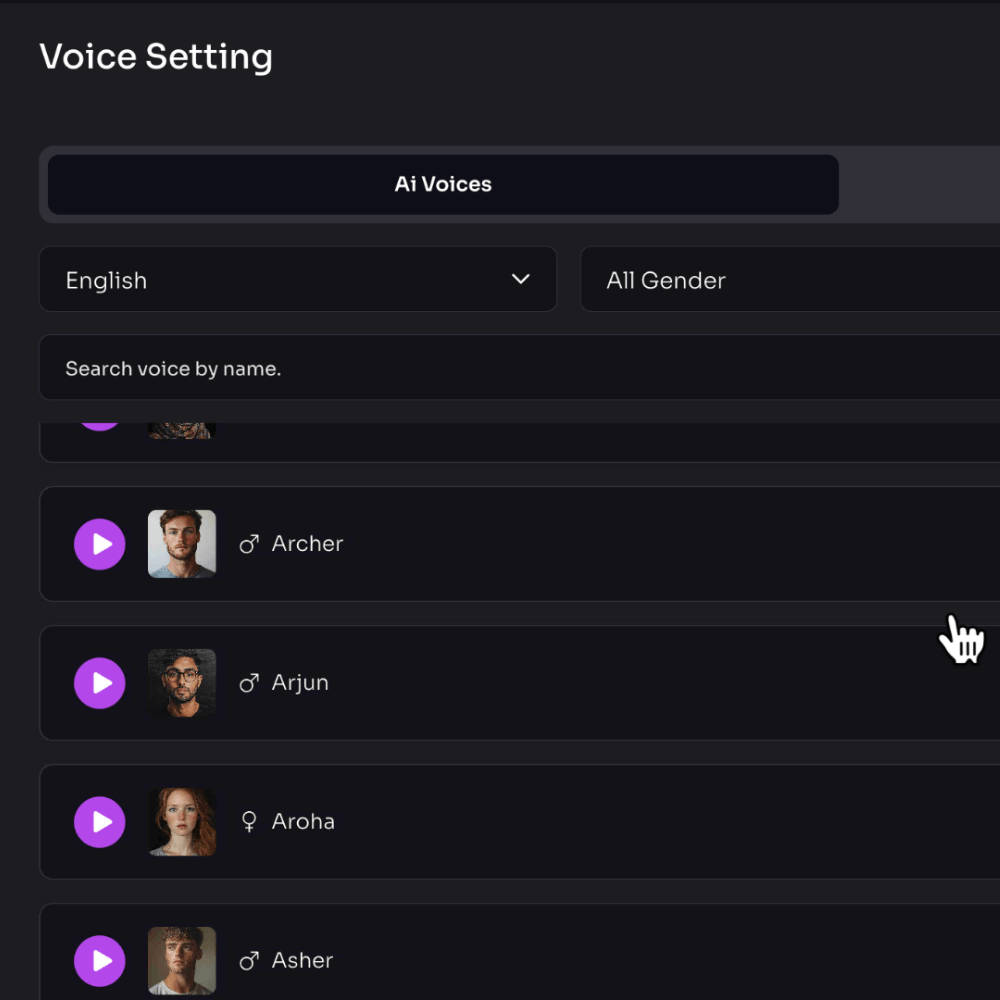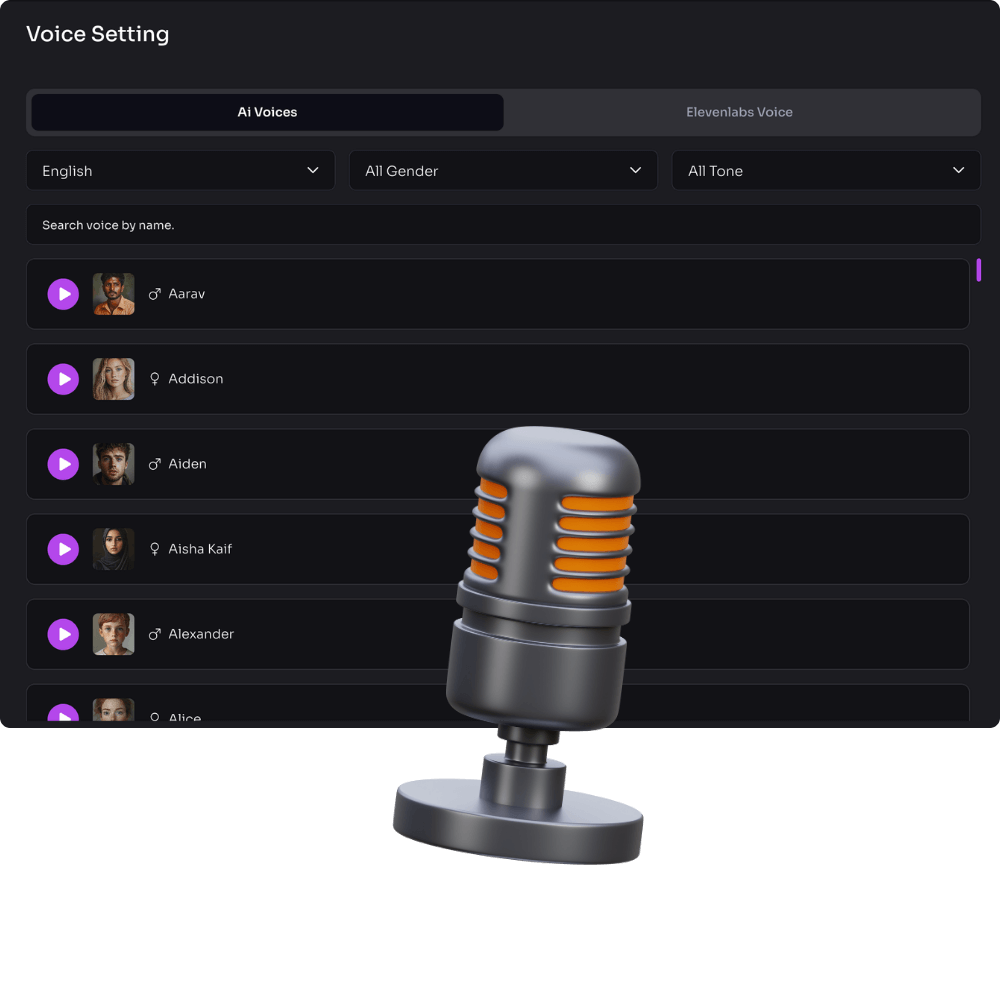 Choose from ultra-realistic AI voiceovers across different age ranges. This allows you to publish videos without being on camera while still sounding human and engaging.