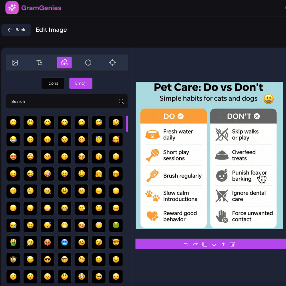 Upload your own images, regenerate the AI image, and customize with text, emojis, shapes, and more.