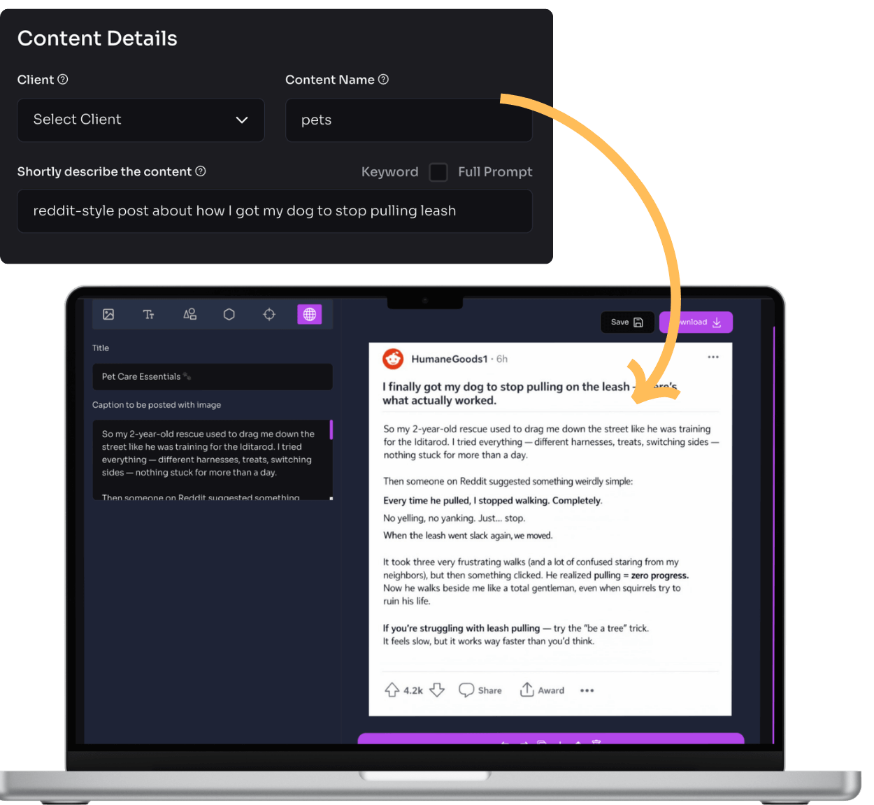 Then, it goes to work creating viral content and stunning visuals to help you stand out on timelines. Easily regenerate text, regenerate AI images, and edit anything in the drag/drop editor.