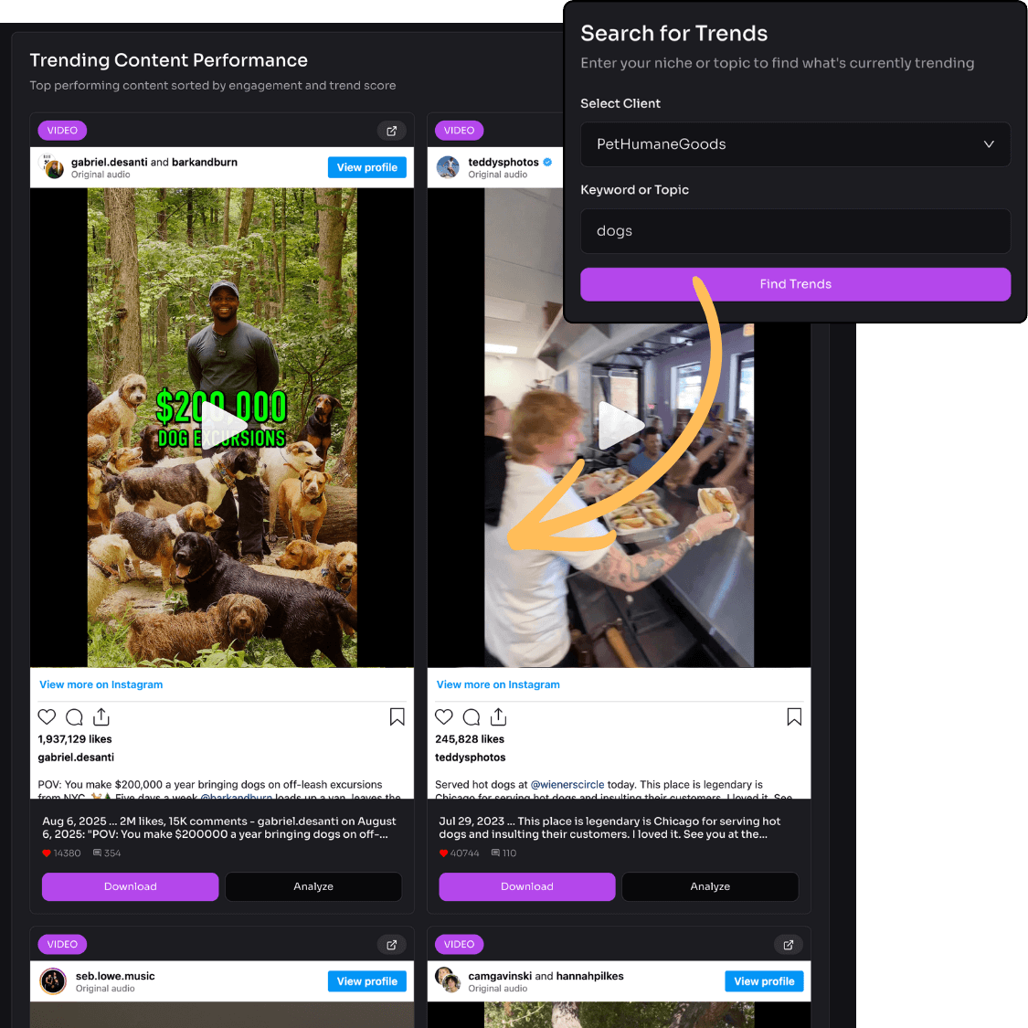 Scans Instagram for rising trends & content patterns that align with your biz & content.